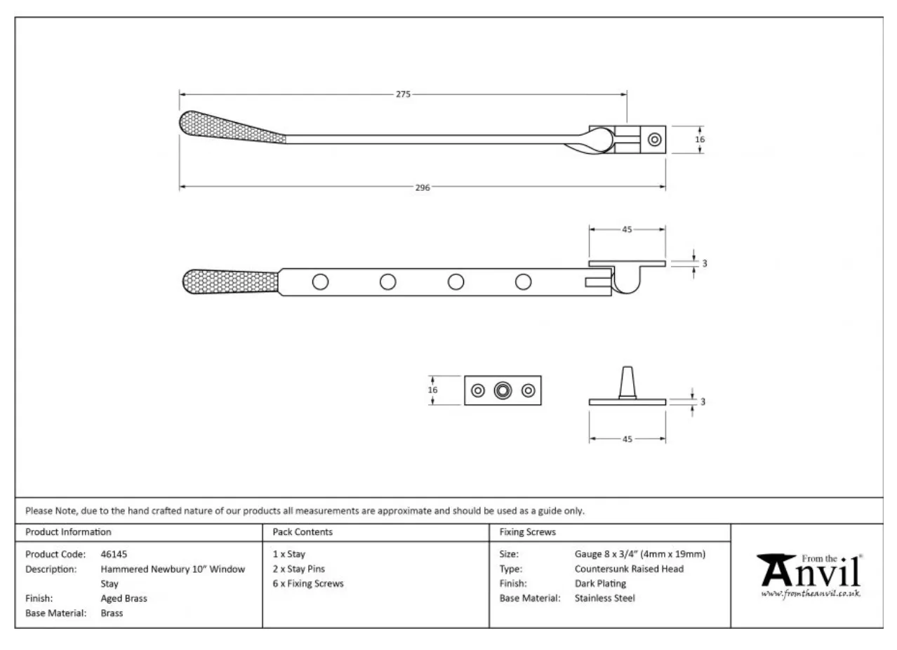 Anvil (10″”) Aged Brass Hammered Newbury Casement Window Stay | 46145