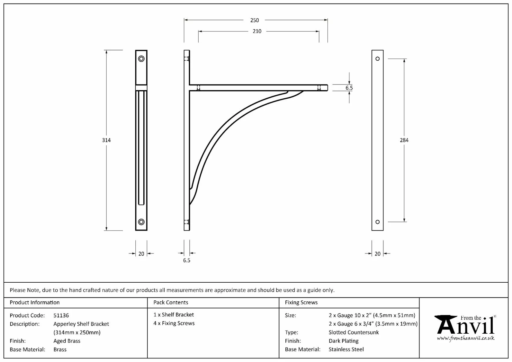 From the Anvil Aged Brass 314 x 250mm Apperley Shelf Bracket| 51136