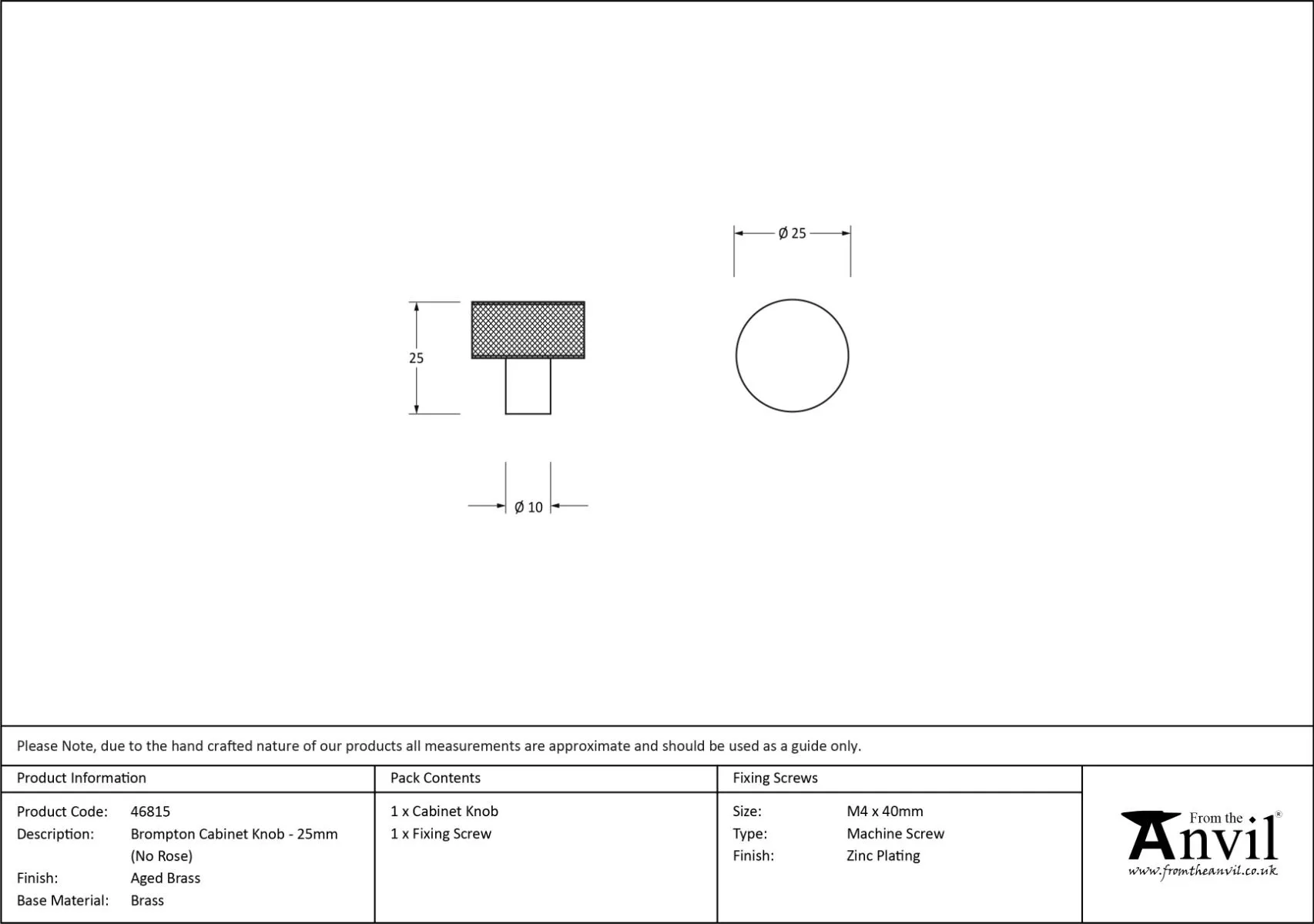 From the Anvil Aged Brass Brompton 25mm Cabinet Knob | 46815