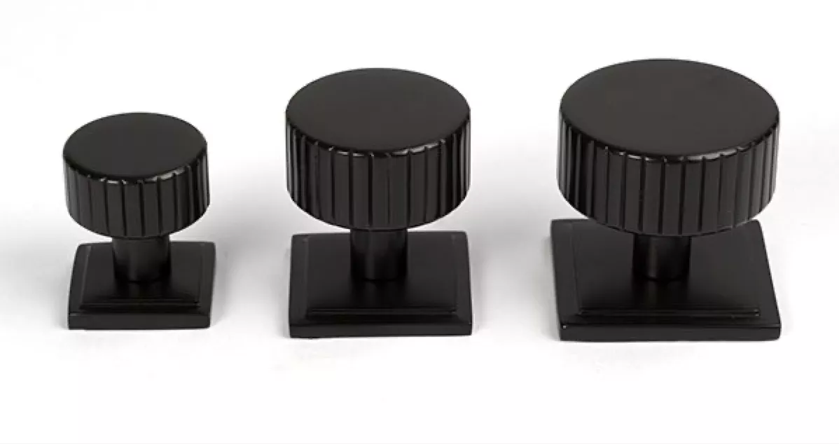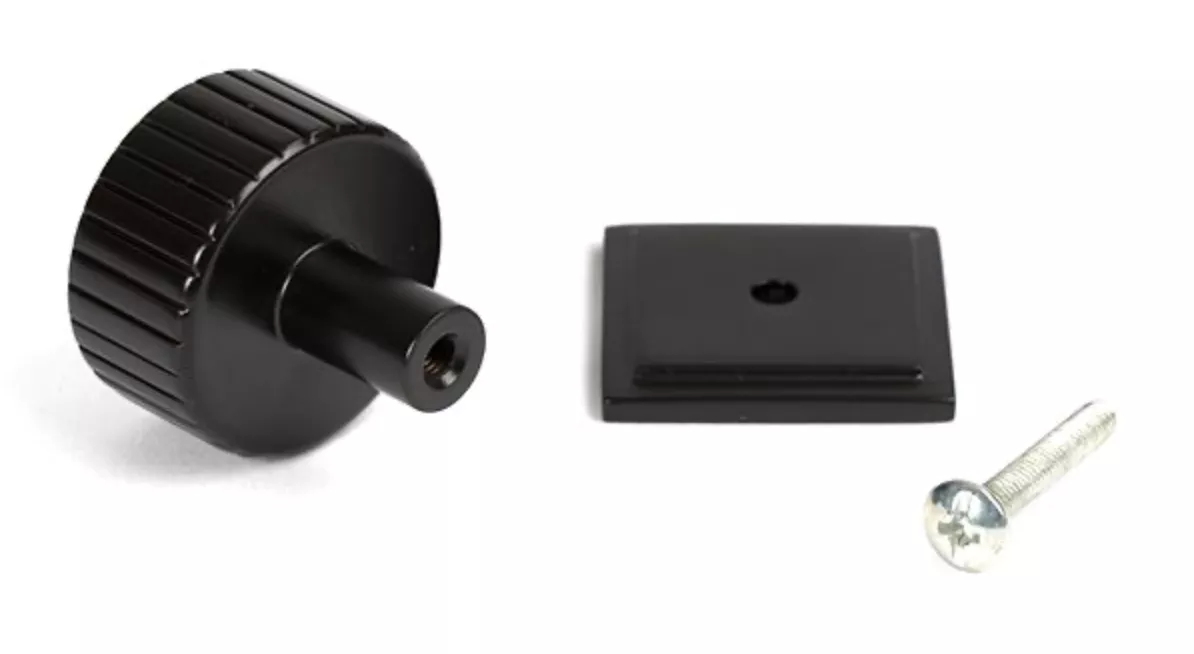 - This cabinet knob features a simple square rose which adds an angular contrast to the round knob.