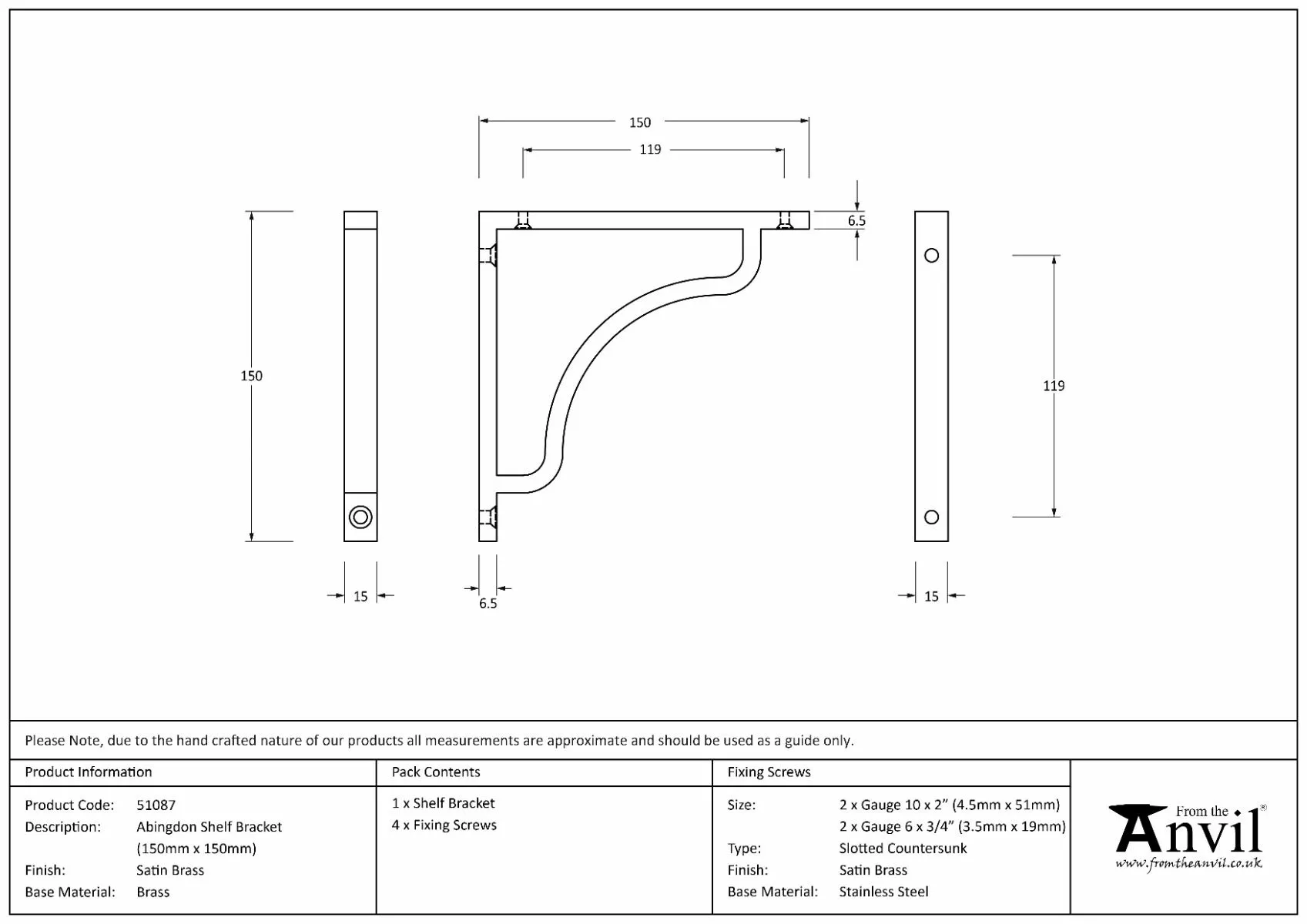 From the Anvil Satin Brass 150 x 150mm Abingdon Shelf Bracket| 51087