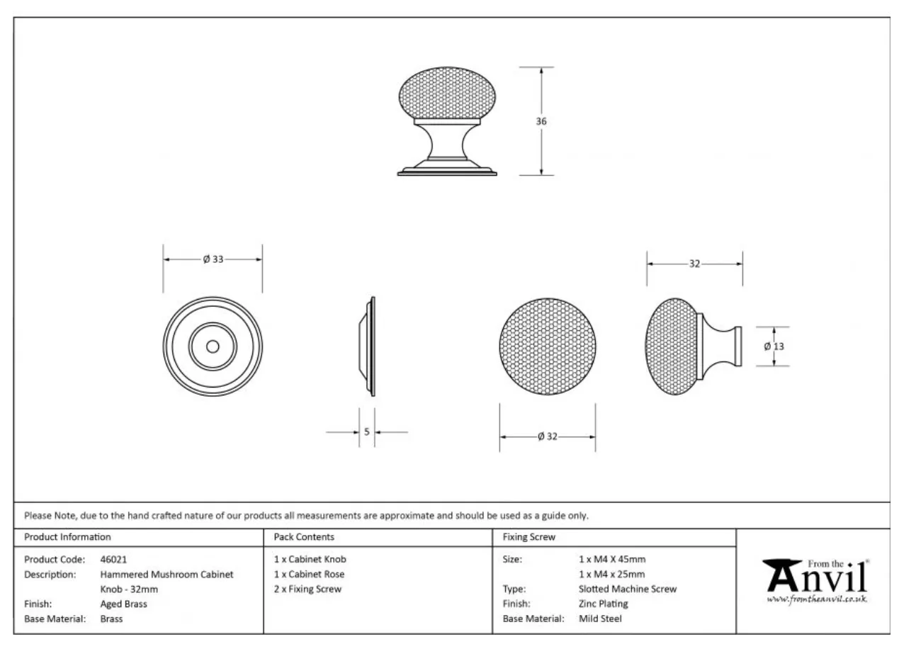 From the Anvil Aged Brass Hammered Mushroom 32mm Cabinet Knob | 46021