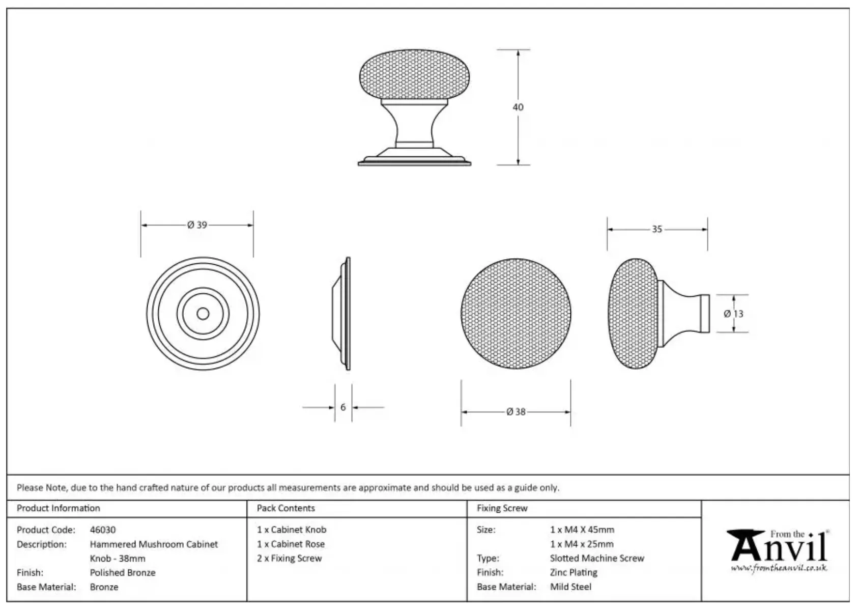 From the Anvil Polished Bronze Hammered 38mm Cabinet Knob | 46030