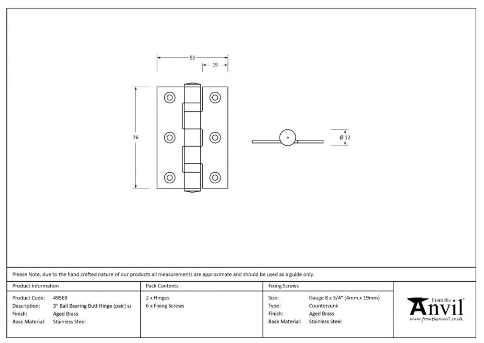 Pair Anvil Aged Brass 3″ (76mm) Ball Bearing Butt Hinge | 49569