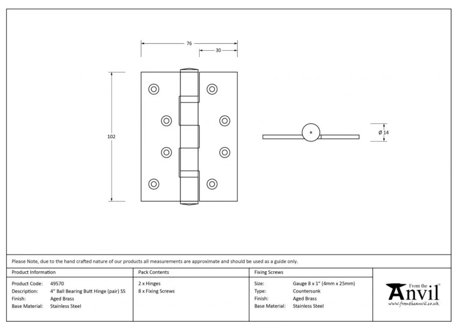 Pair Anvil Aged Brass 4″ (102mm) Ball Bearing Butt Hinge | 49570