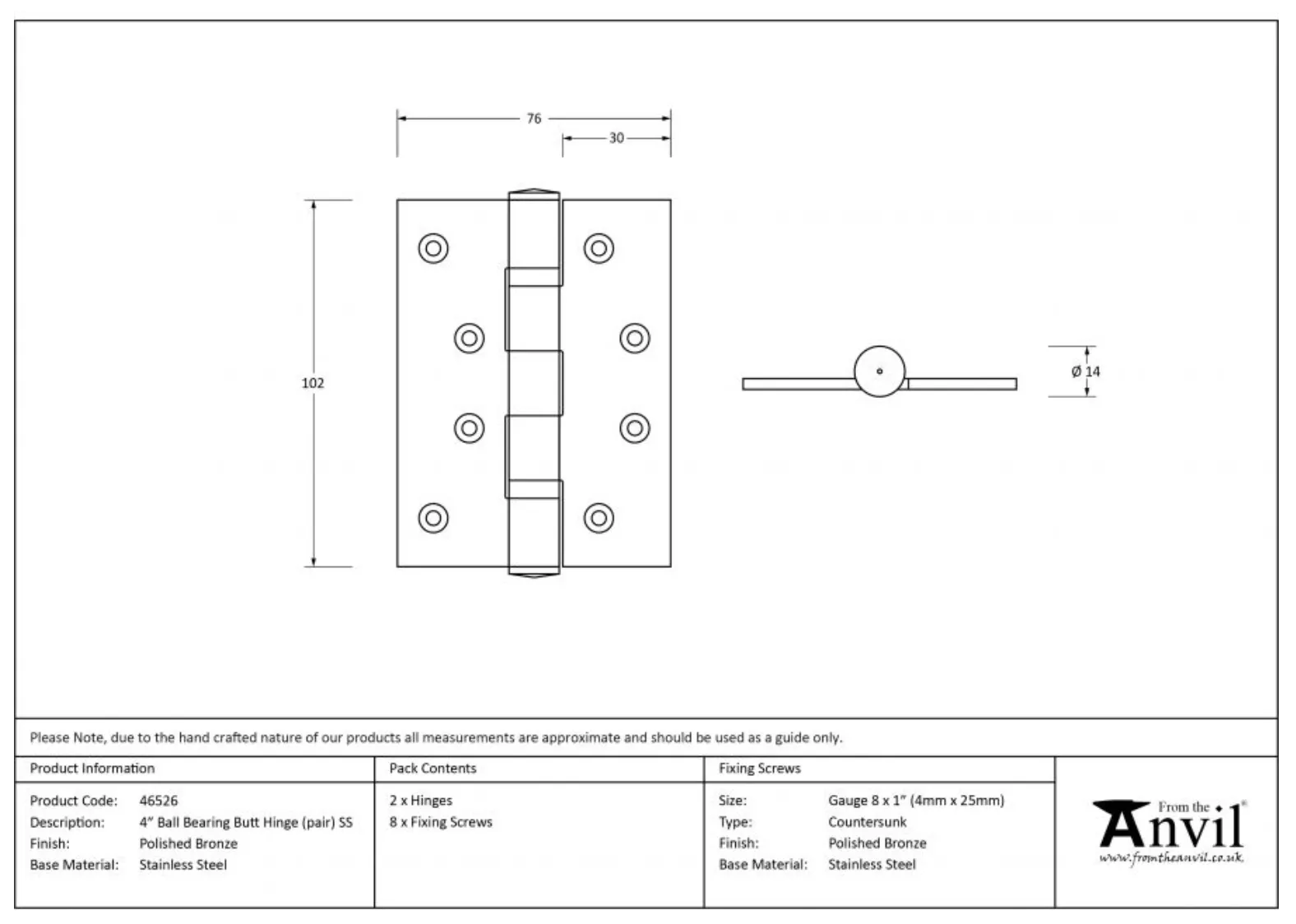 Pair Anvil Polished Bronze 4″ (102mm) Ball Bearing Butt Hinge | 46526