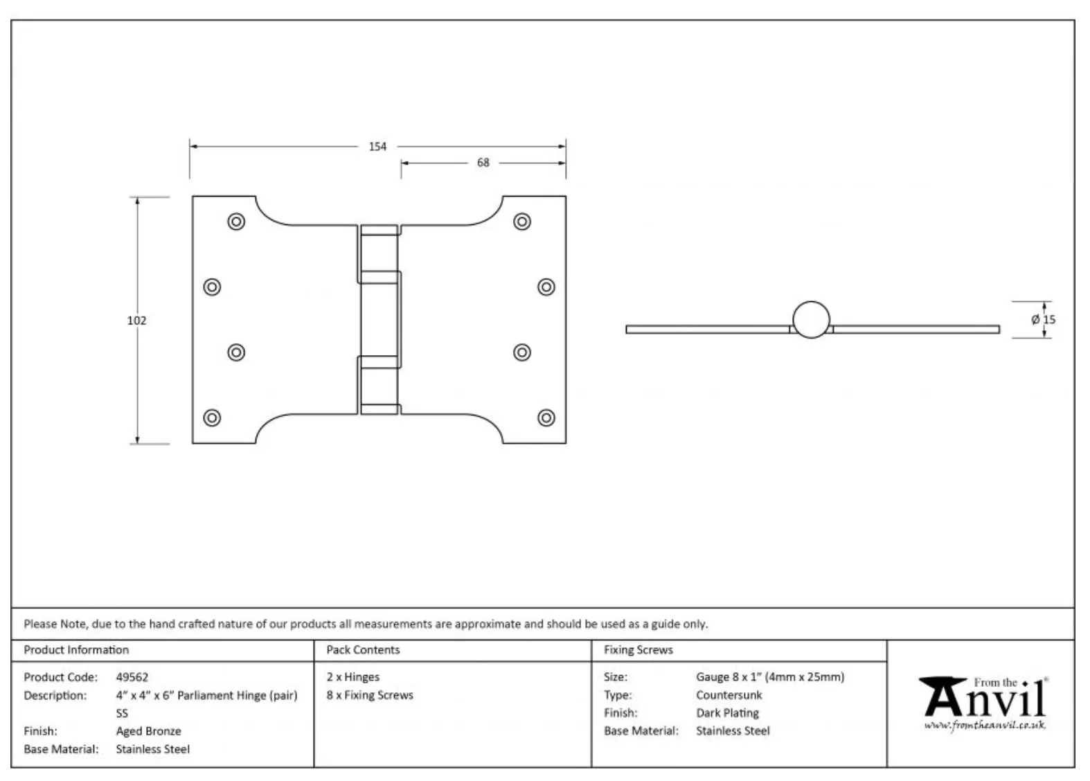 - Hinge Size:102mm x 152mm