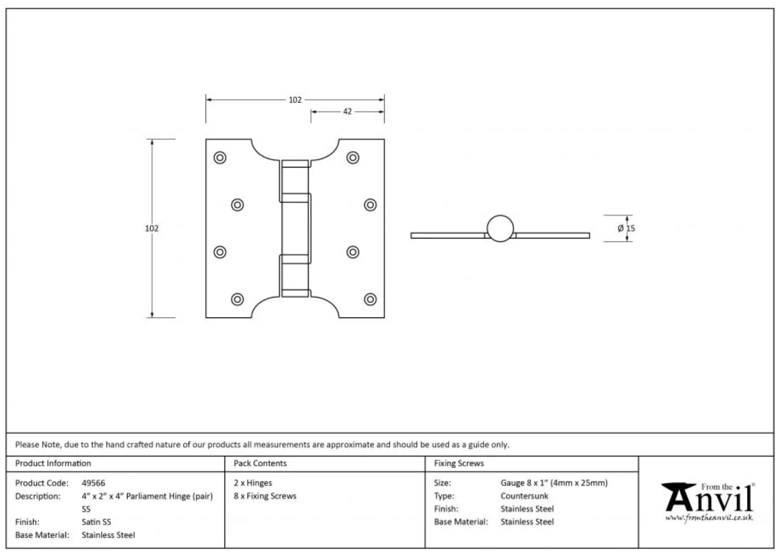 Pair From the Anvil Satin Stainless Steel 4x2x4″ Parliament Hinge | 49566