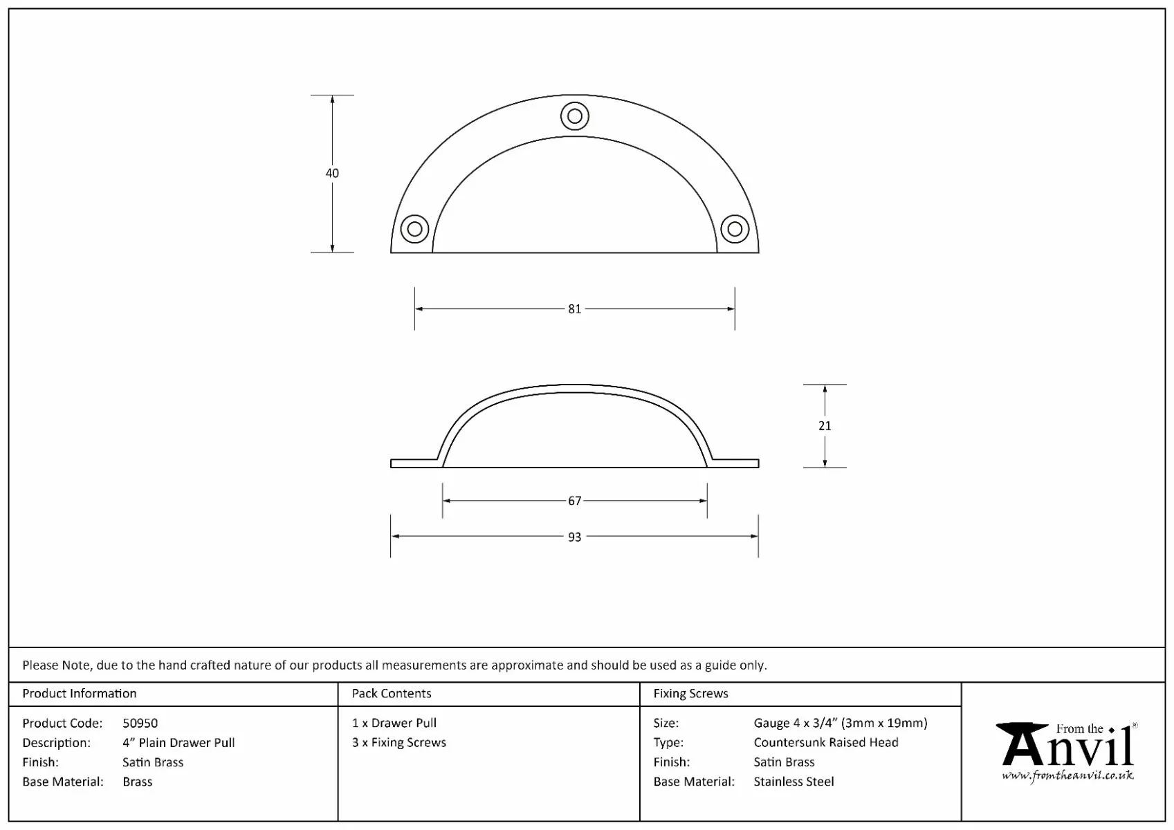 From the Anvil Satin Brass 4″ Plain Drawer Pull | 50950