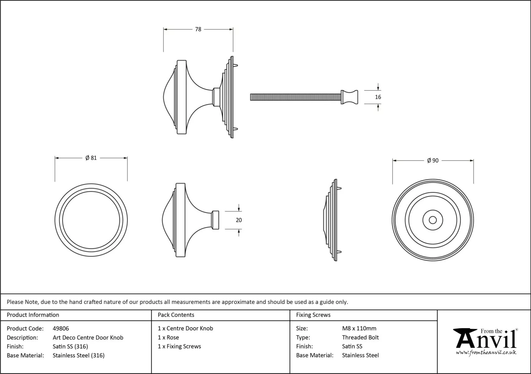 From the Anvil Satin SS (316) Art Deco Centre Door Knob | 49806