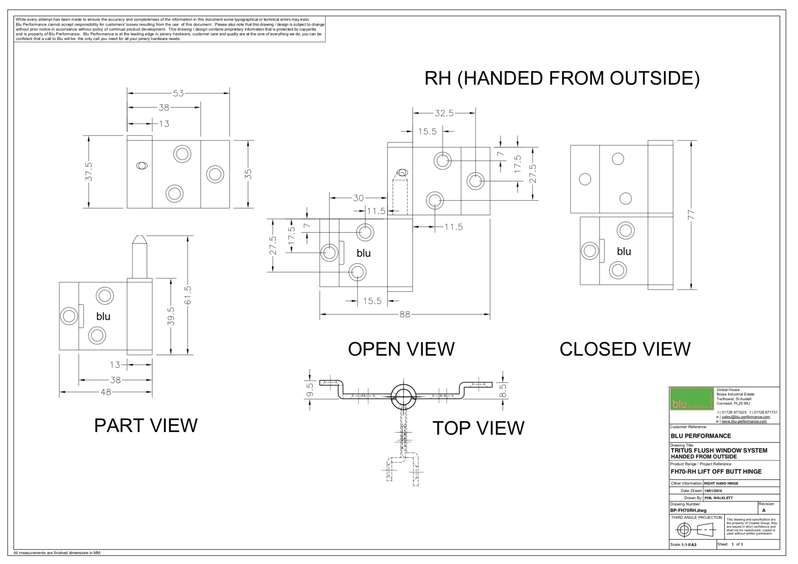 PVD Polished Brass Right Hand Flush Lift Off Butt Hinge | FH70RH PPB
